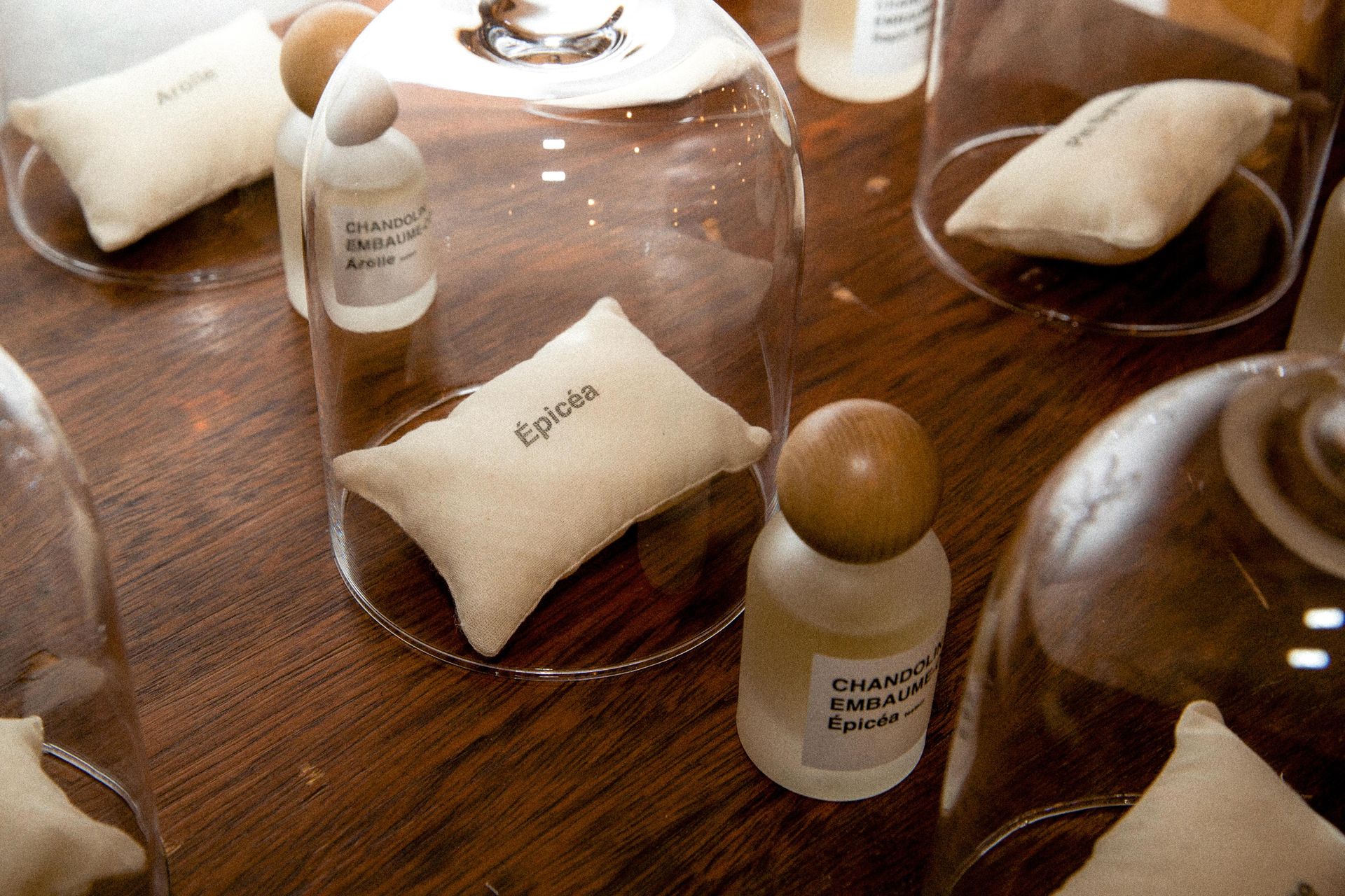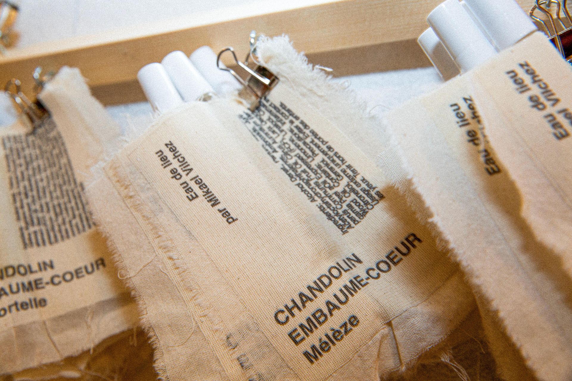 Chaque œuvre est accompagnée de son eau de parfum artisanale à concentra- tion élevée, remise à l’acquéreur avec la pièce. Le parfum peut être porté sur la peau ou vaporisé sur l’œuvre, selon le geste et l’intention. Le public peut éga- lement acquérir des eaux de lieux, plus légères, pensées comme une première rencontre avec ces senteurs.