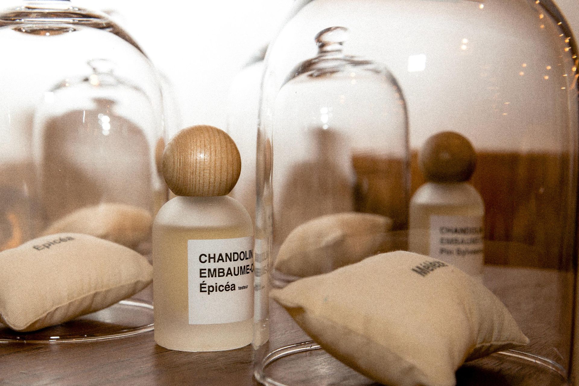 Six conifères de Chandolin en forment le cœur, entourés de notes de bergamote, de cuir, de cacao, d’ambre et de bois : l’arolle à l’élégance discrète, le sapin blanc aux accents agrumes inattendus, l’épicéa familier, le pin noir sombre et viril, le pin sylvestre aux accents marins en altitude, et le mélèze - roi fragile qui se dépouille en hiver avant de renaître au printemps.