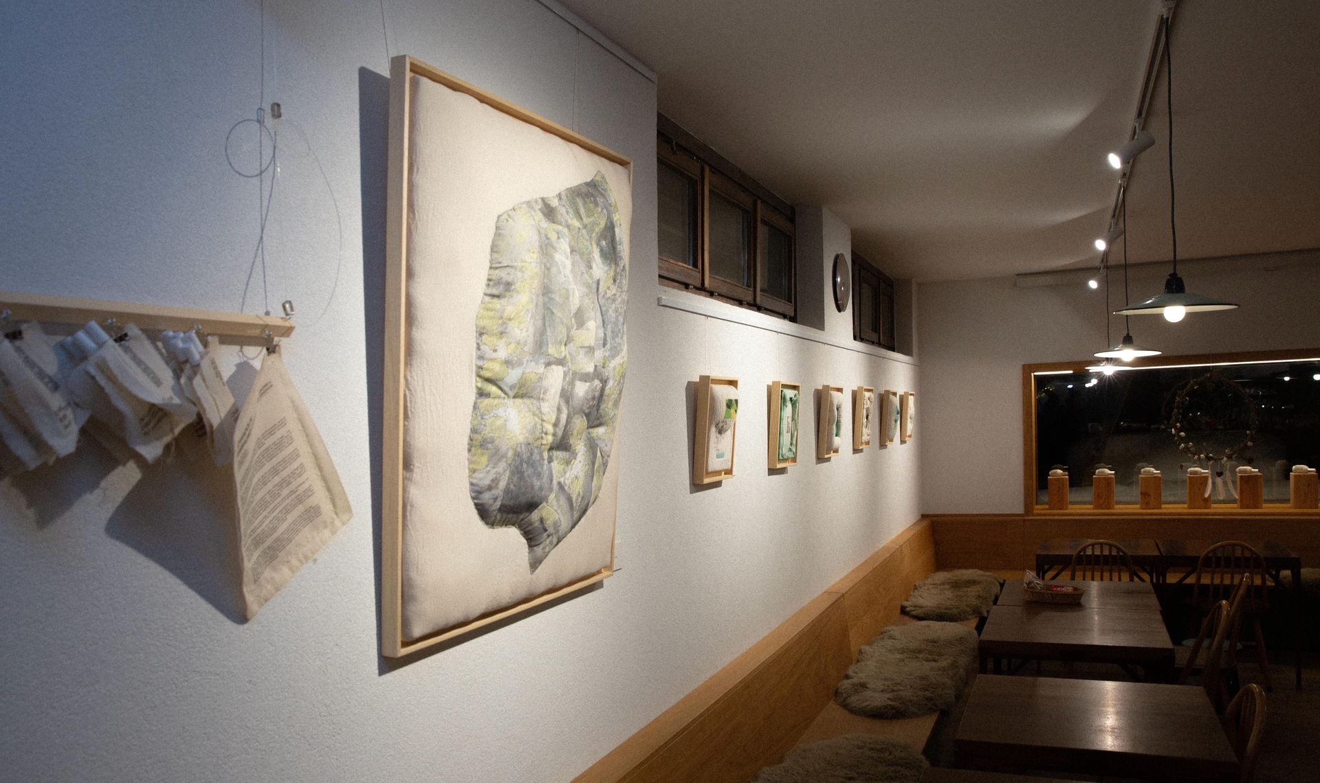 Les œuvres sont des pièces textiles où la matière dialogue avec l’image — bro- dée, imprimée ou dessinée. Certains éléments figuratifs se dissolvent dans le relief et la texture, rendant la lecture plus abstraite, plus contemplative. Le tex- tile cesse d’être une simple surface pour devenir un territoire intérieur où l’oeil s’attarde et où le nez vient se poser, prolongeant l’expérience vers une dimen- sion olfactive.